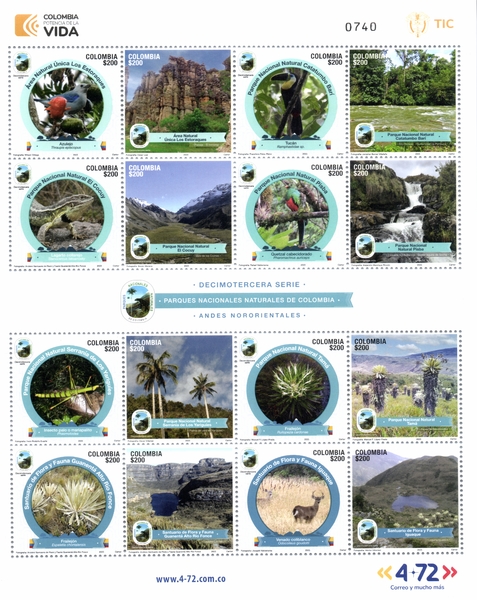 Parques presentes en esta emisión filatélica correspondientes a la Región Andes Nororientales: 1) Área Natural Única Los Estoraques; 2) Parque Nacional Natural Catatumbo Barí; 3) Parque Nacional Natural El Cocuy; 4) Parque Nacional Natural Pisba; 5) Parque Nacional Natural Serranía de Los Yariguíes; 6) Parque Nacional Natural Tamá; 7) Santuario de Flora y Fauna Guanentá Alto Río Fonce; 8) Santuario de Flora y Fauna Iguaque.